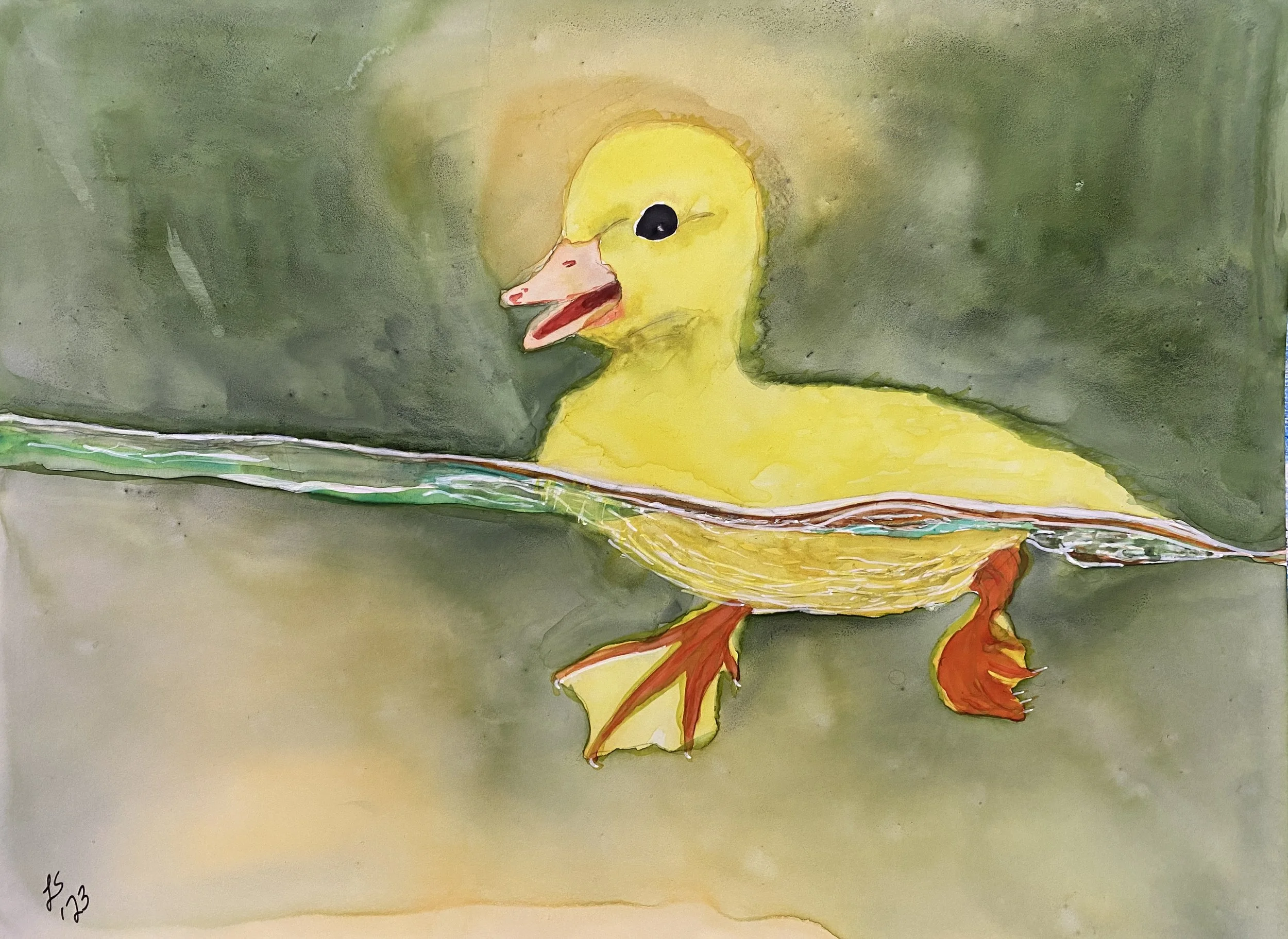 A duckling paddling through water with its feet showing under the water. Watercolor on mineral paper, 9 x 12 in., $100 framed original.