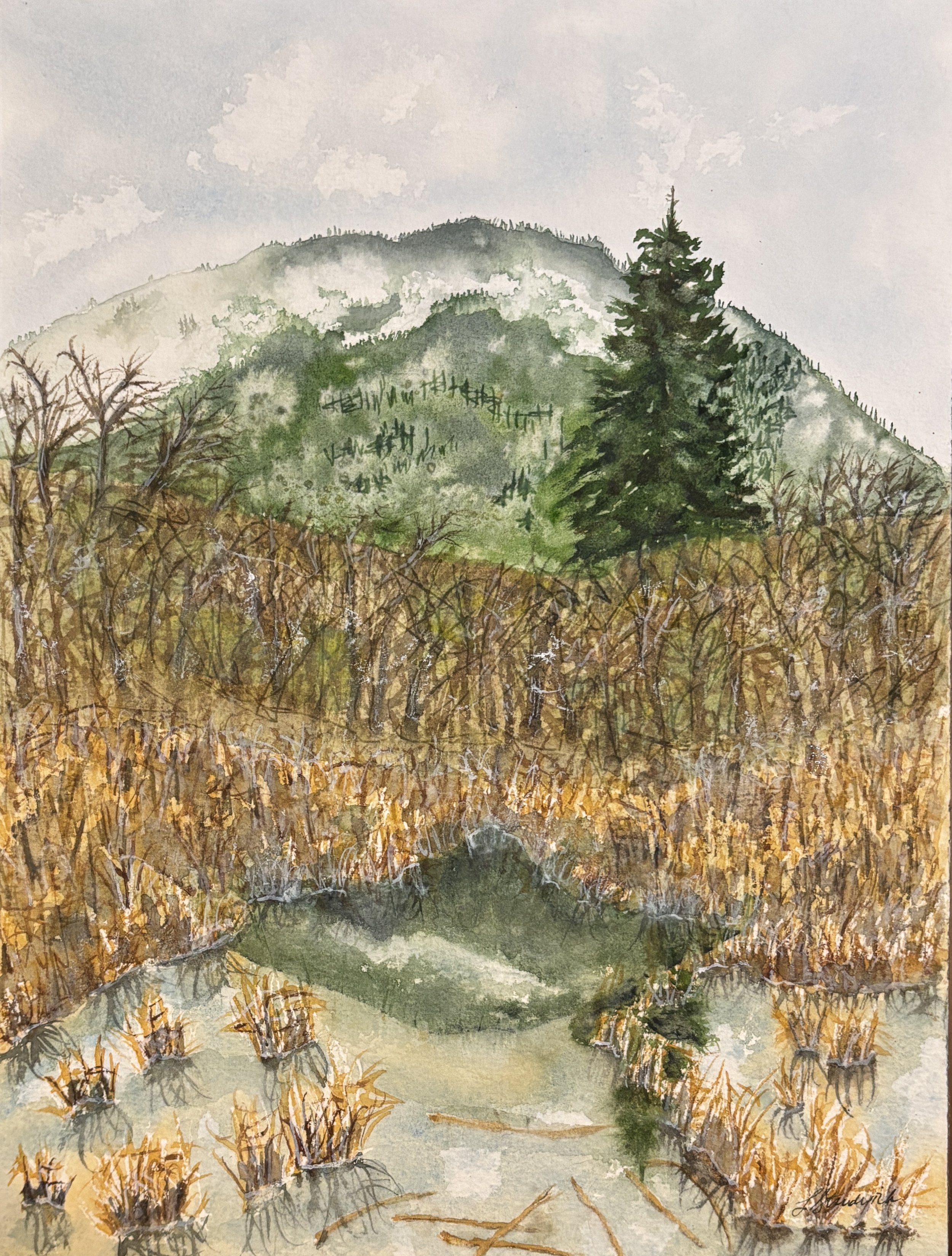 The marsh with cattails and leafless trees and Boulder Ridge in the background at Wildwood State Park, Welches, OR. Watercolor, on 300 lb. cold-pressed paper, 9 x 12 in., $180 framed original.